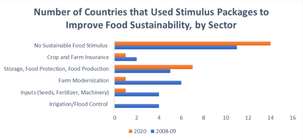 Although prevalent in both crises, more countries in our sample supported food security and sustainable agriculture in their stimulus packages in 2008-2009 versus 2020.